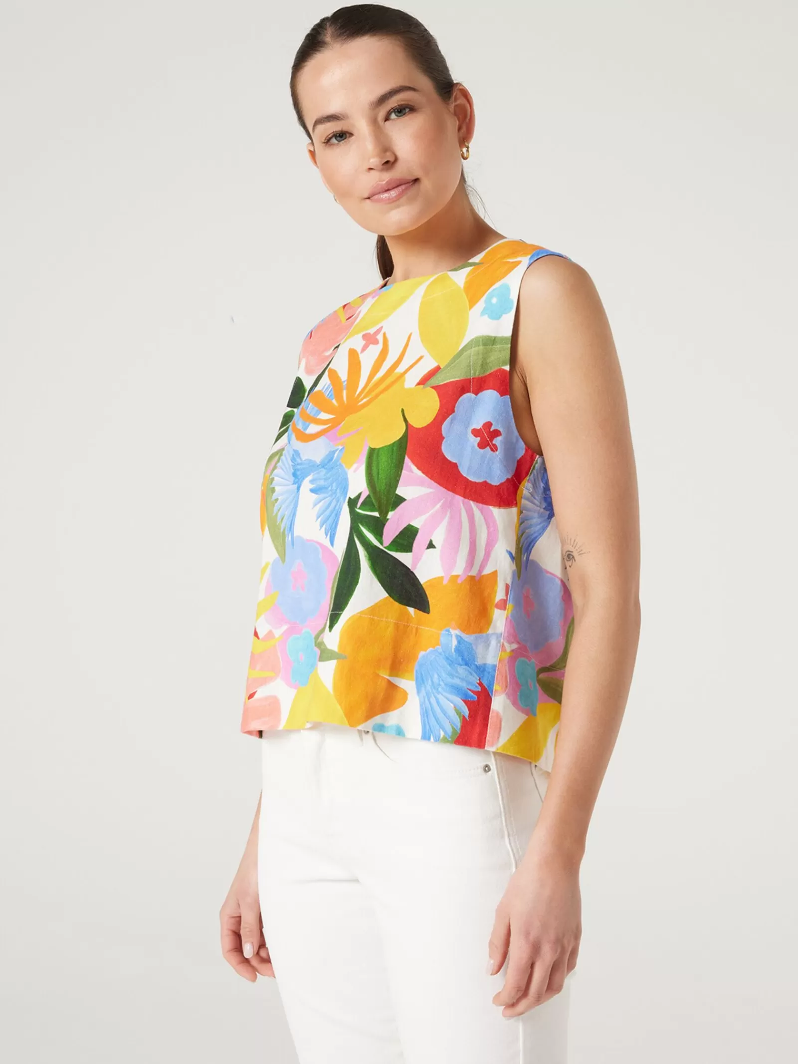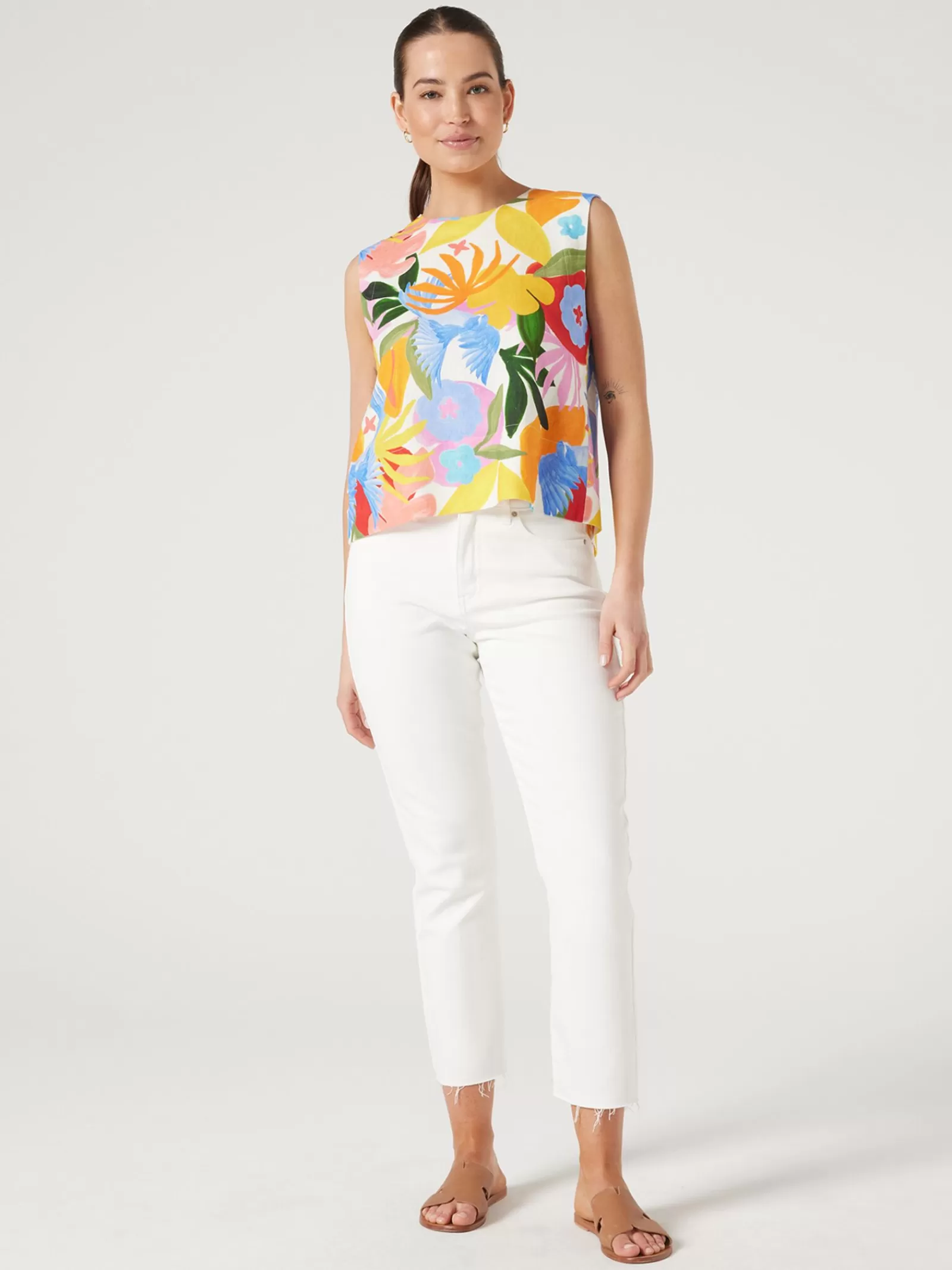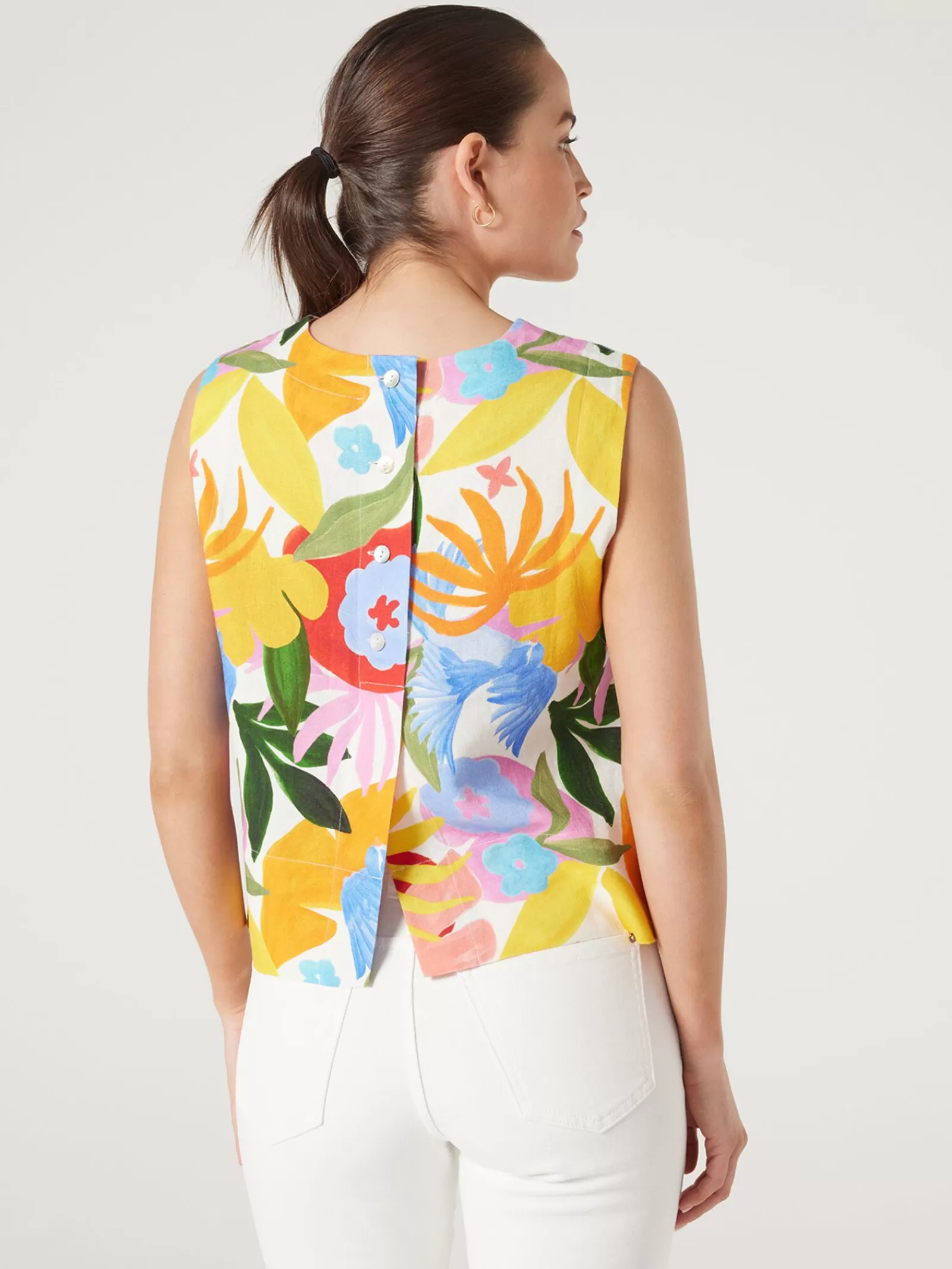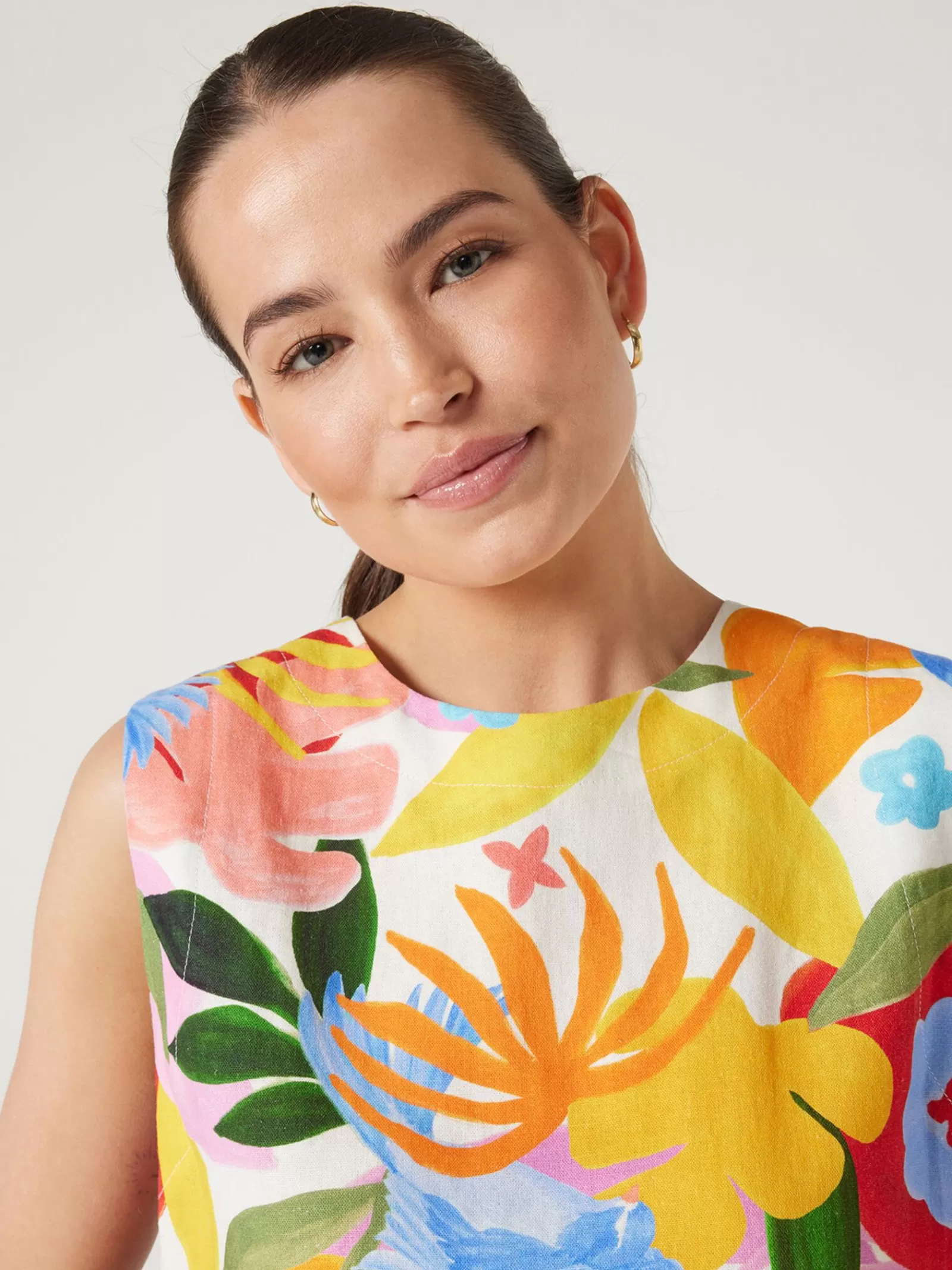 This flattering linen tank is the perfect basic to dress up or down for versatile outfit options. With a boxy, cropped, sleeveless structure, and crew-neck, this style pairs perfectly with high waisted denim or linen trousers.