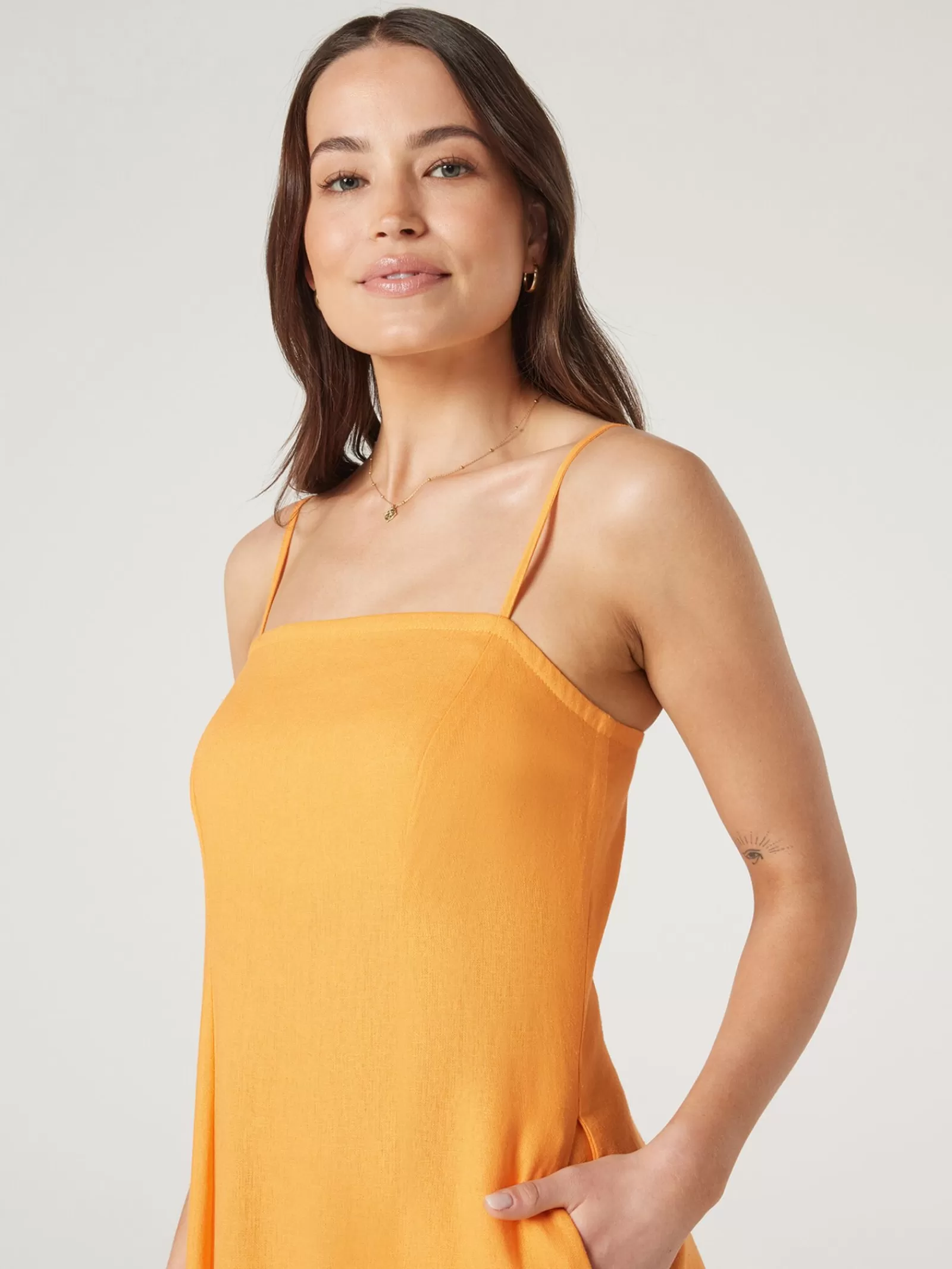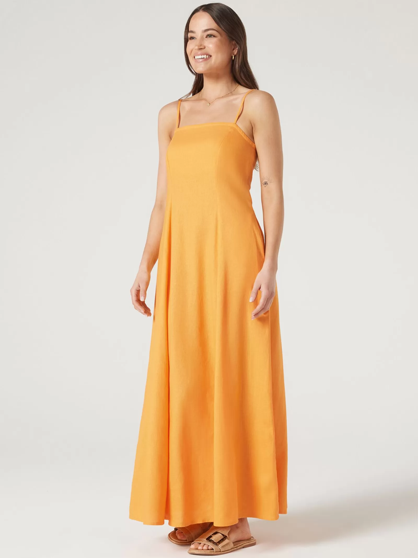 Sleek and refined in structure, this lightweight linen maxi-dress features flattering spaghetti straps on a fit-and-flare silhouette. Perfect to pair with strappy sandals for a sunday brunch, this look is finished with in-seam pockets and a shirred back for added comfort.