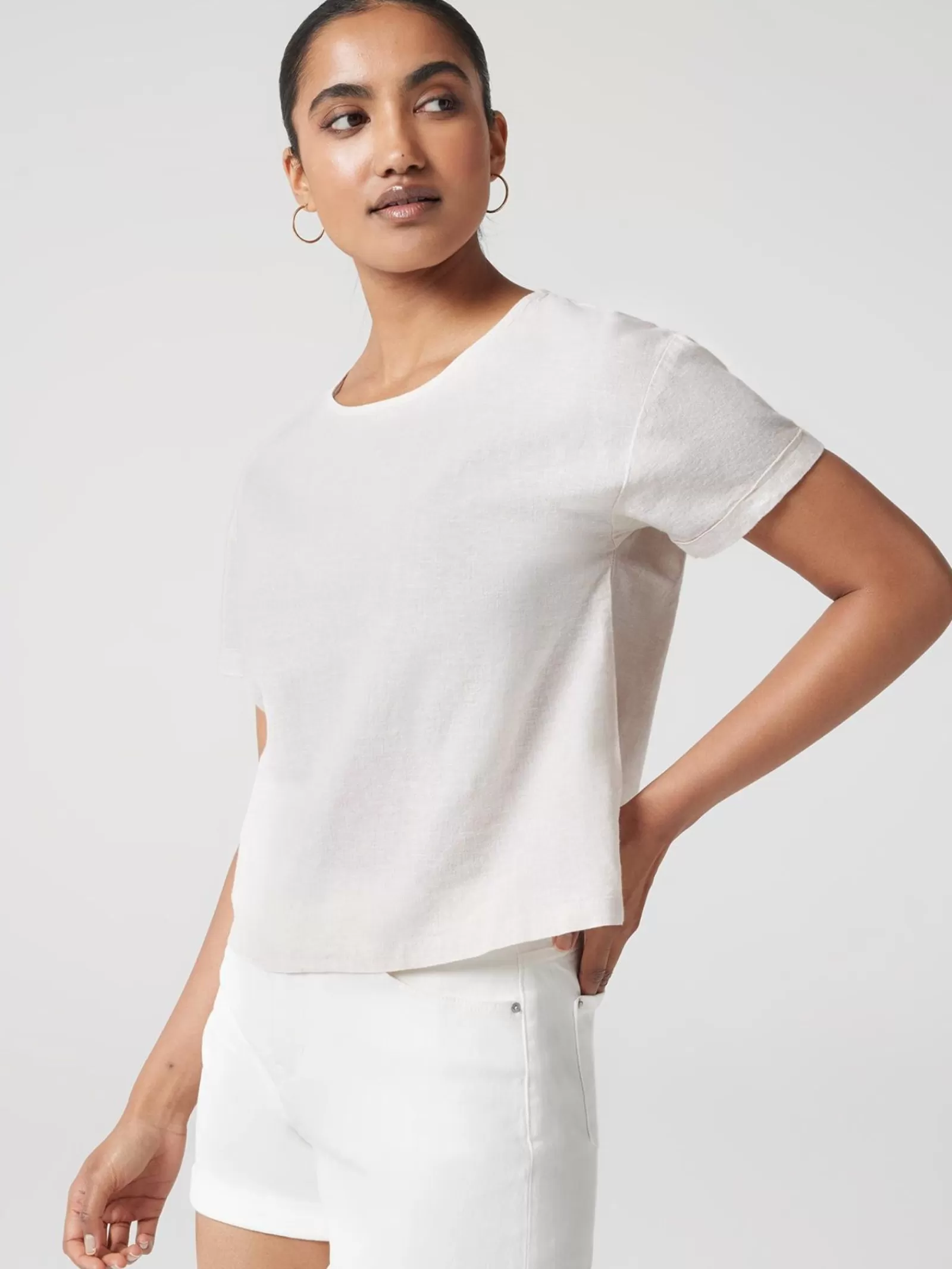 Crafted from a breathable linen blend fabrication, this classic, relaxed fit tee features a crew neckline, and short cuffed sleeves. Details like the side split and center back keyhole opening elevate the look.